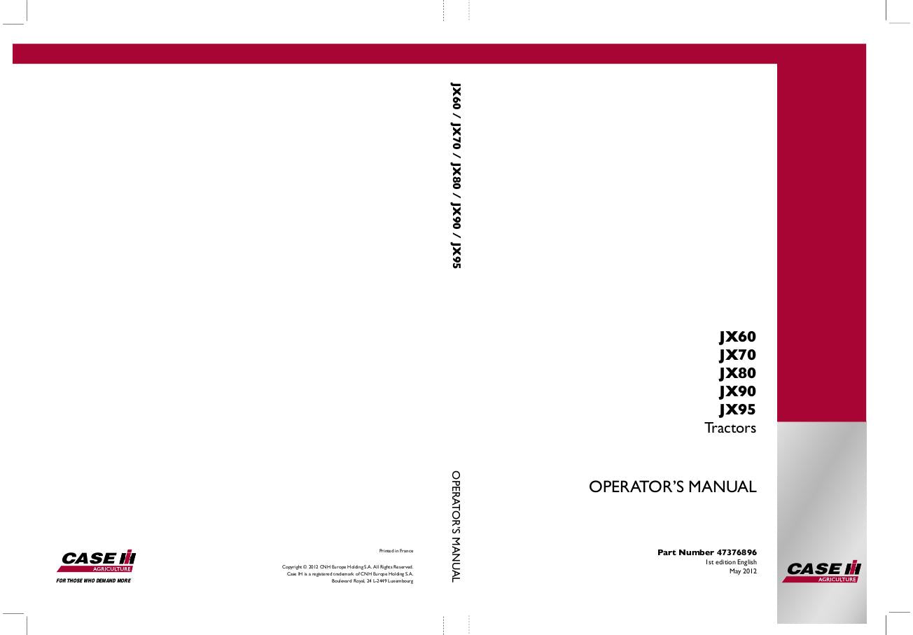 It is an Complete Factory original factory Operator's Manual For Case IH Tractor JX 60 70 80 90 95 Operator’s. We Offers Manual HIGH quality images, diagrams, instructions to help you to operate. This document is printable, without restrictions, contains searchable text, bookmarks, crosslinks for easy navigation.