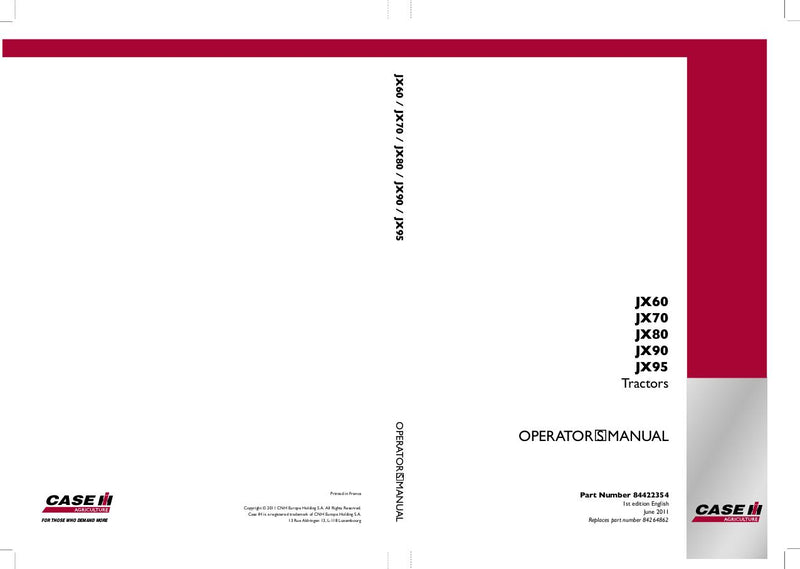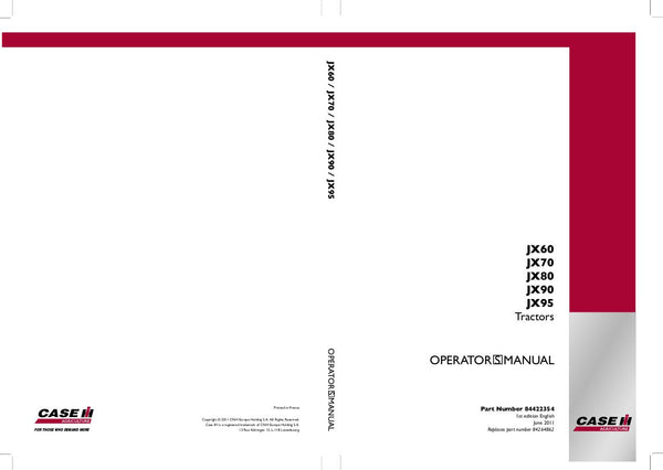 It is an Complete Factory original factory Operator's Manual For Case IH Tractor JX60 70 80 90 95 Operator’s. We Offers Manual HIGH quality images, diagrams, instructions to help you to operate. This document is printable, without restrictions, contains searchable text, bookmarks, crosslinks for easy navigation.