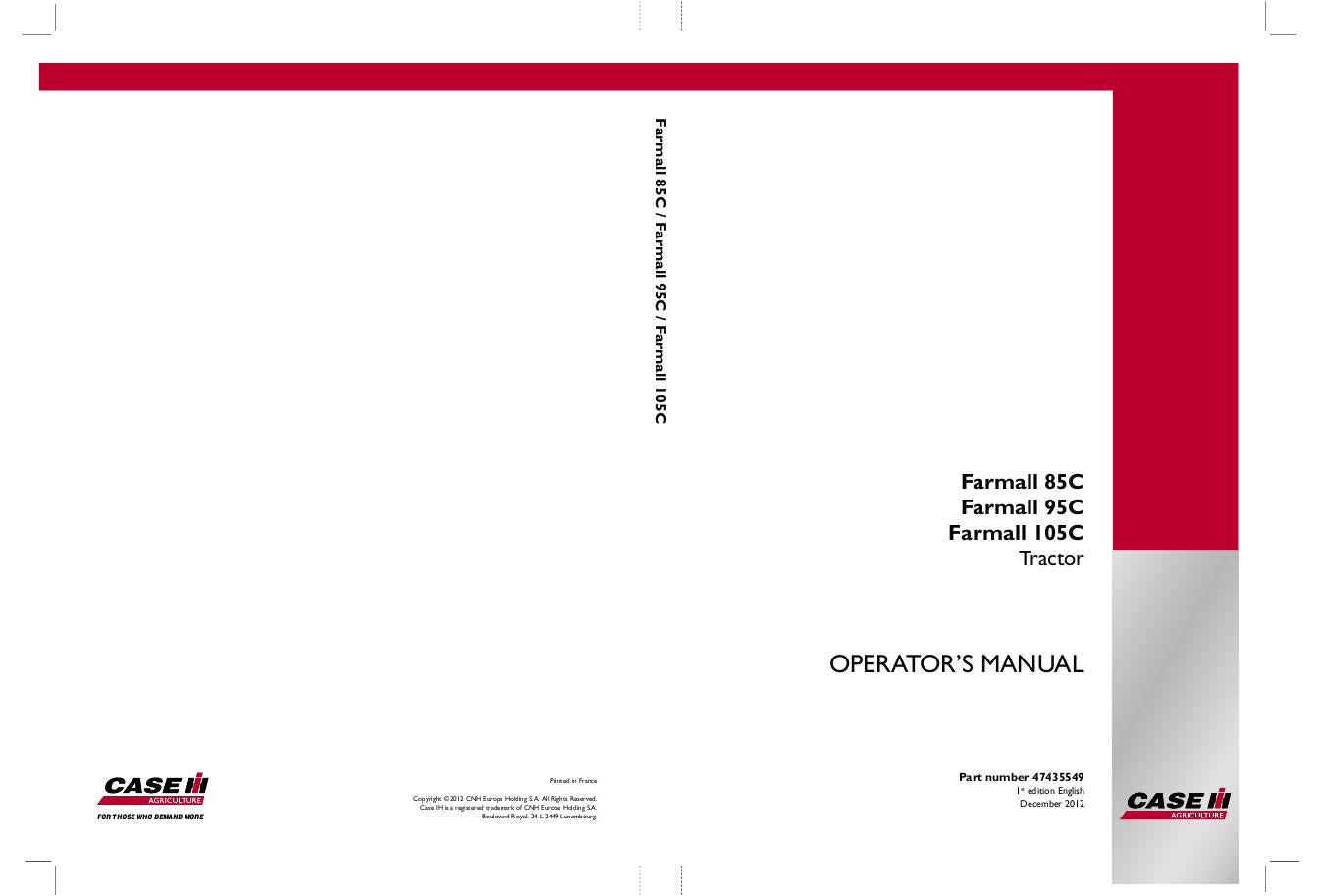 It is an Complete Factory original factory Operator's Manual For Case IH Tractor Farmall 85C 95C 05C Operator’s. We Offers Manual HIGH quality images, diagrams, instructions to help you to operate. This document is printable, without restrictions, contains searchable text, bookmarks, crosslinks for easy navigation.