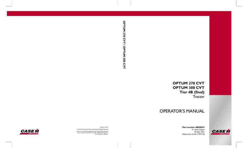 It is an Complete Factory original factory Operator's Manual For Case IH Tractor Optum 270 CVT Optum 300 CVT Tier 4B (final). We Offers Manual HIGH quality images, diagrams, instructions to help you to operate. This document is printable, without restrictions, contains searchable text, bookmarks, crosslinks for easy navigation.