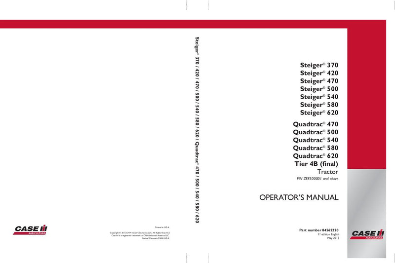 It is an Complete Factory original factory Operator's Manual For Case IH Tractor Steiger Quadtrac 470 500 540 580 620 Tier 4B. We Offers Manual HIGH quality images, diagrams, instructions to help you to operate. This document is printable, without restrictions, contains searchable text, bookmarks, crosslinks for easy navigation.