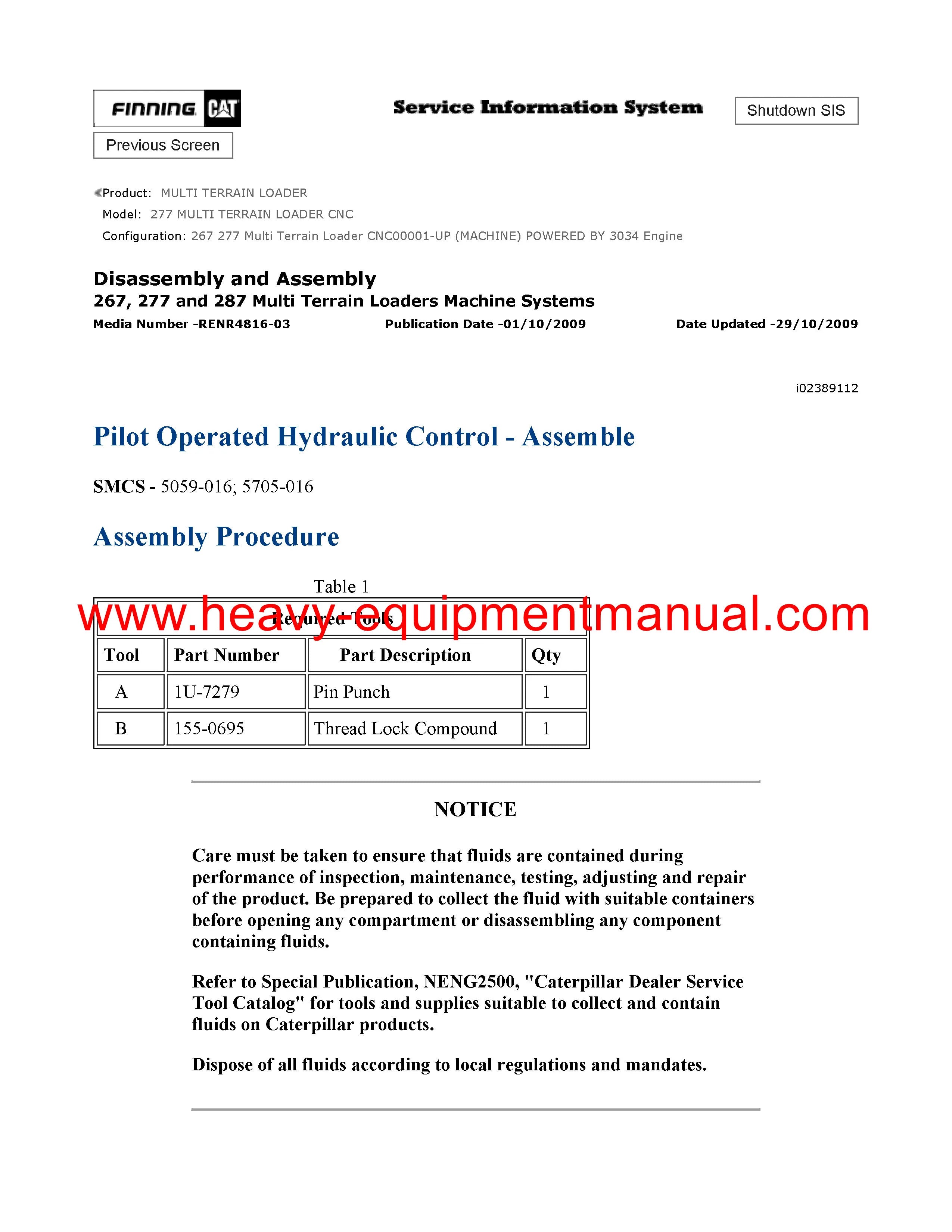 It is Complete Original Factory for Caterpillar 277 MULTI TERRAIN LOADER. Covers all the service and repair information about Caterpillar 277 MULTI TERRAIN LOADER. The information in this manual covers everything you need to know when you want to service and repair Caterpillar 277 MULTI TERRAIN LOADER.