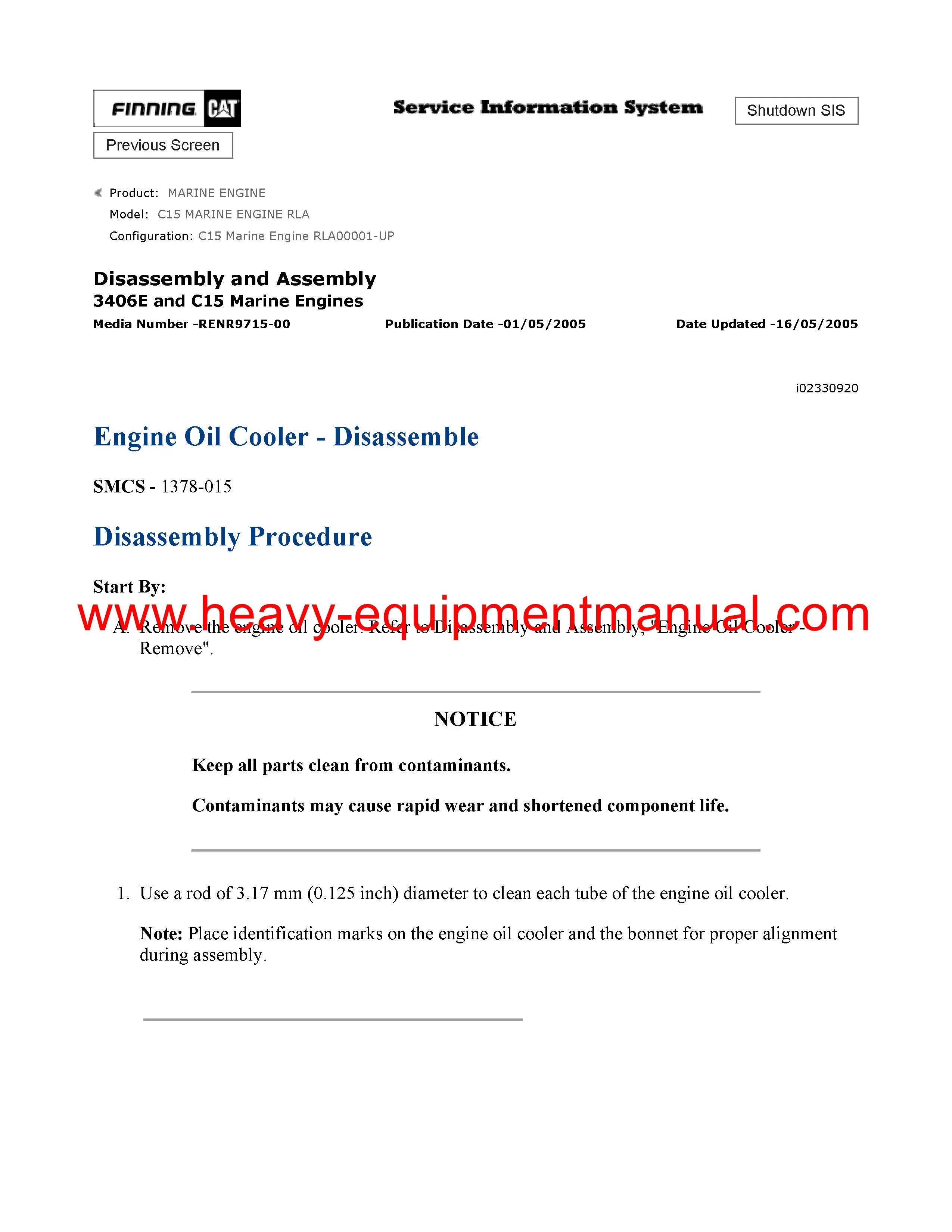 It is Complete Original Factory for Caterpillar C15 MARINE ENGINE. Covers all the service and repair information about Caterpillar C15 MARINE ENGINE. The information in this manual covers everything you need to know when you want to service and repair Caterpillar C15 MARINE ENGINE.