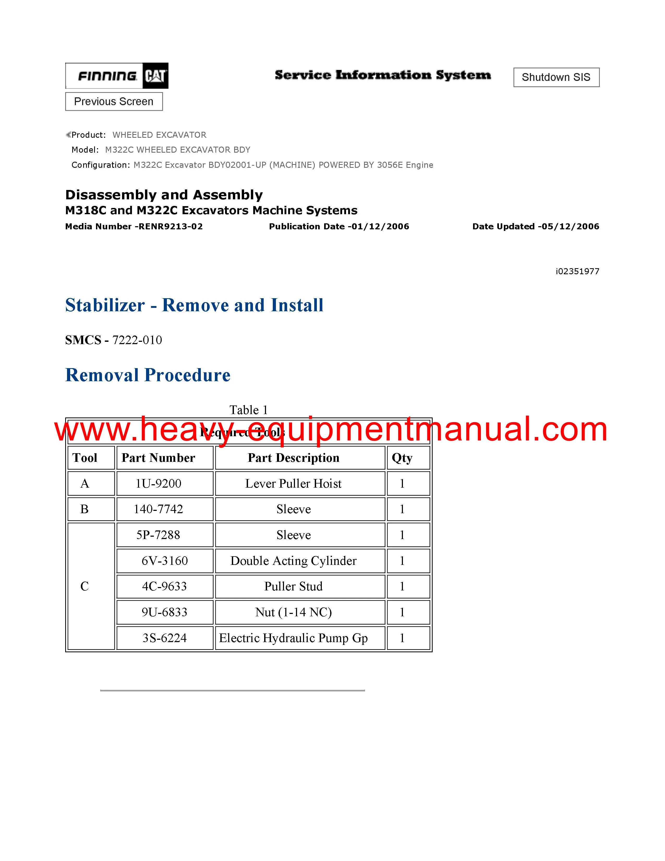 Caterpillar M322C WHEELED EXCAVATOR Disassembly and Assembly Manual