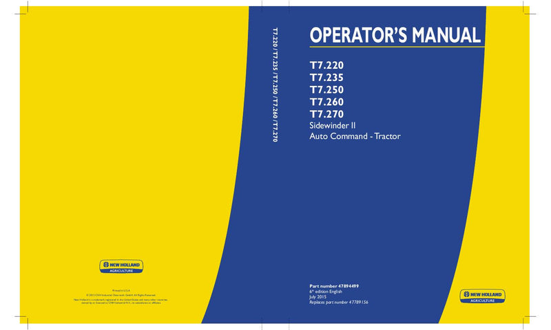 Download New Holland T7.220 , T7.235 , T7.250 , T7.260 , T7.270 Sidewinder II Auto Command Tractor Operator's Manual (July 2015)