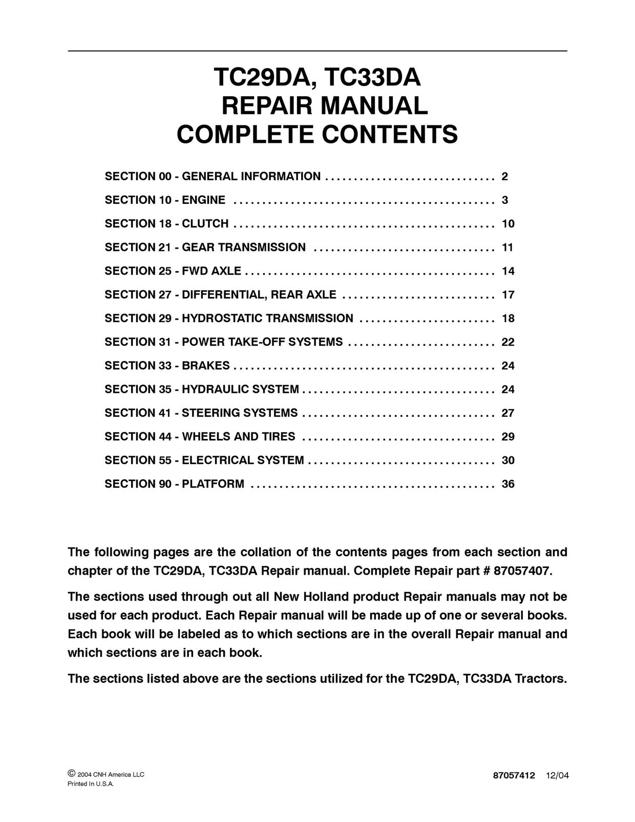 It is Complete Original Factory for New Holland TC29DA, TC33DA Tractor. Covers all the service and repair information about New Holland TC29DA, TC33DA Tractor. The information in this manual covers everything you need to know when you want to service and repair New Holland TC29DA, TC33DA Tractor.