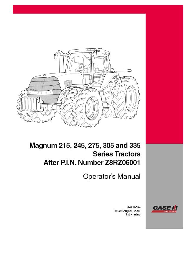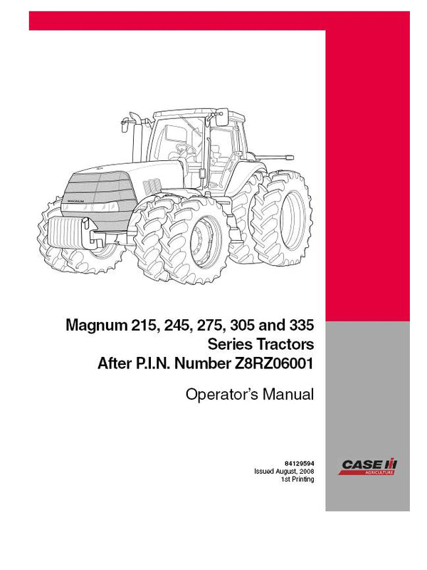It is an Complete Factory original factory Operator's Manual For Case IH Tractor Magnum 215 245 275 305 and 335 after Pin Z8RZ06001 Operator’s. We Offers Manual HIGH quality images, diagrams, instructions to help you to operate. This document is printable, without restrictions, contains searchable text, bookmarks, crosslinks for easy navigation.