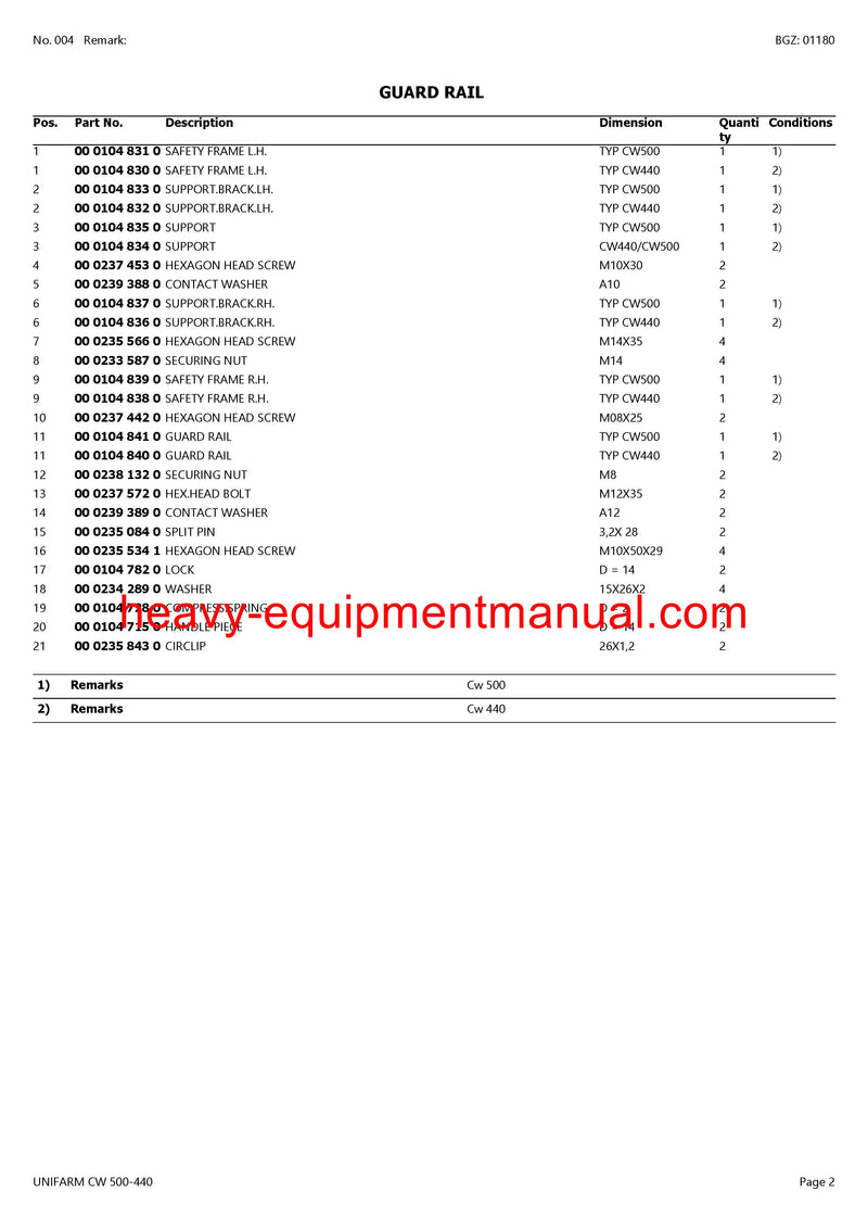 CLAAS UNIFARM CW 500-440 TEDDER PARTS CATALOG MANUAL SN 47201001-47299999