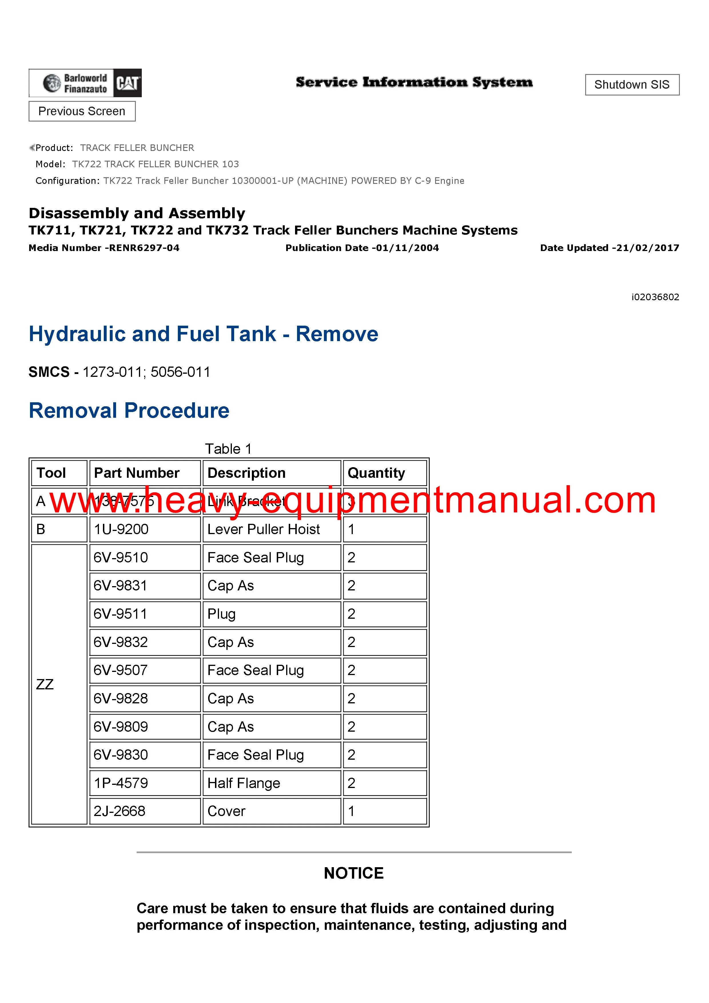 It is Complete Original Factory for Caterpillar TK722 TRACK FELLER BUNCHER. Covers all the service and repair information about Caterpillar TK722 TRACK FELLER BUNCHER. The information in this manual covers everything you need to know when you want to service and repair Caterpillar TK722 TRACK FELLER BUNCHER.
