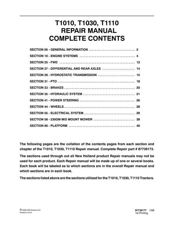 It is Complete Original Factory for New Holland T1010, T1030, T1110 Tractor. Covers all the service and repair information about New Holland T1010, T1030, T1110 Tractor. The information in this manual covers everything you need to know when you want to service and repair New Holland T1010, T1030, T1110 Tractor.