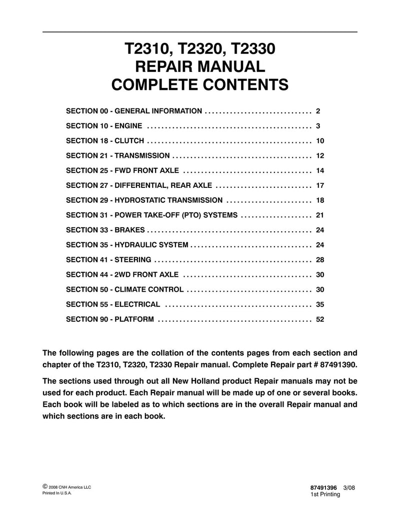 It is Complete Original Factory for New Holland T2310, T2320, T2330 Tractor. Covers all the service and repair information about New Holland T2310, T2320, T2330 Tractor. The information in this manual covers everything you need to know when you want to service and repair New Holland T2310, T2320, T2330 Tractor.