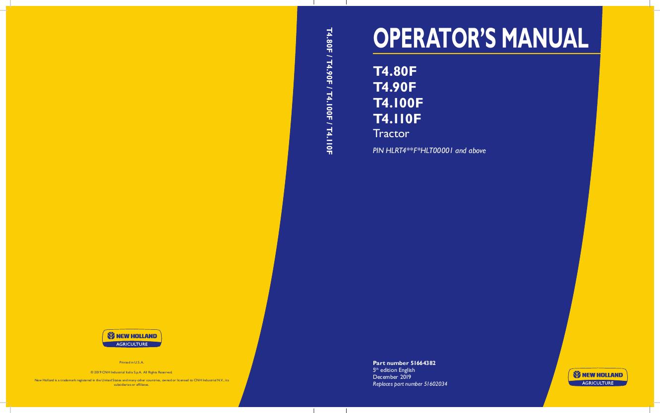 New Holland T4.80F T4.90F T4.100F T4.110F Tractor Operator's Manual 51664382