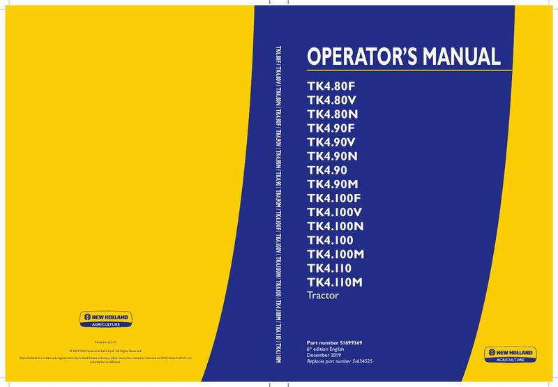 New Holland TK4.80F TK4.80V TK4.80N TK4.100 TK4.100M Tractor Operator's Manual