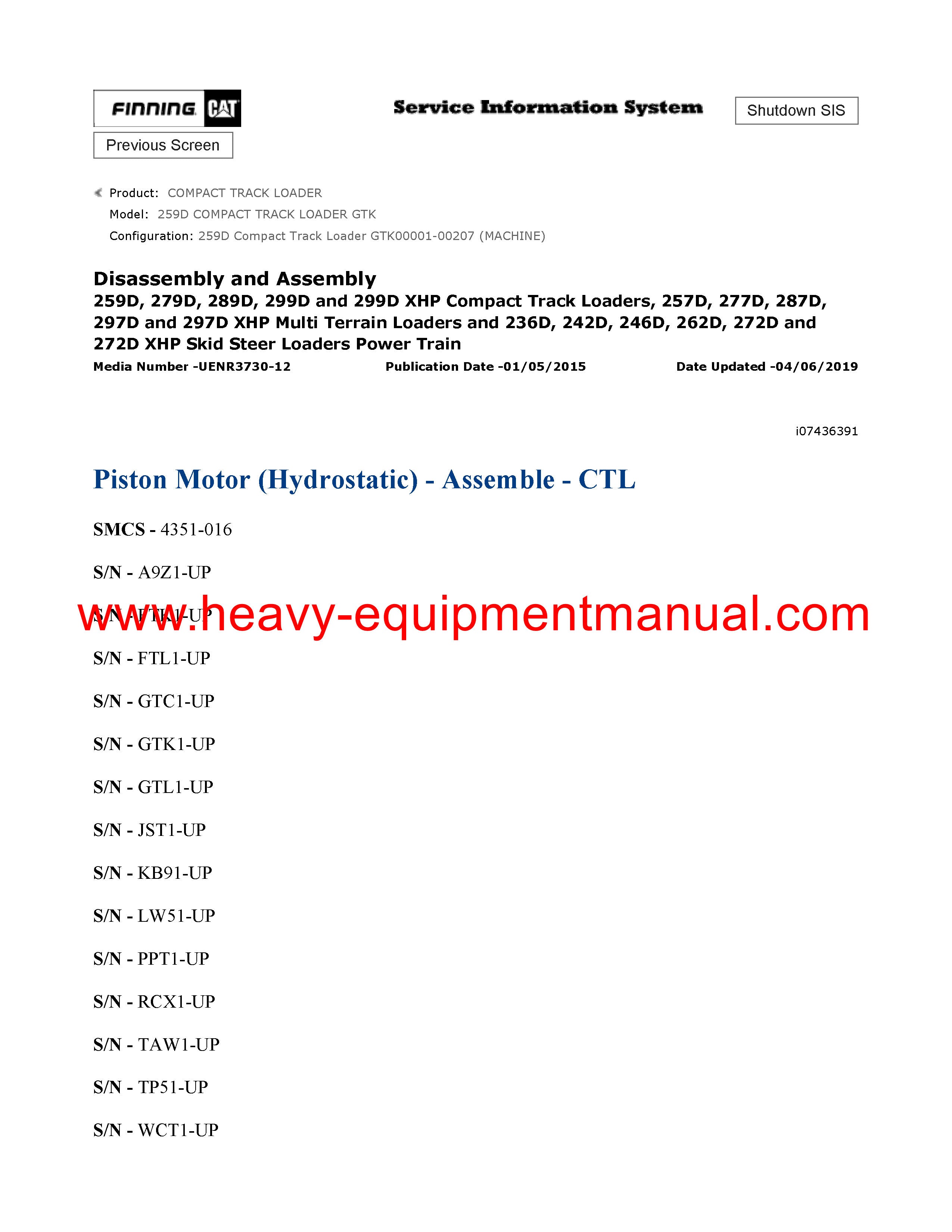 It is Complete Original Factory for Caterpillar 259D COMPACT TRACK LOADER. Covers all the service and repair information about Caterpillar 259D COMPACT TRACK LOADER. The information in this manual covers everything you need to know when you want to service and repair Caterpillar 259D COMPACT TRACK LOADER.