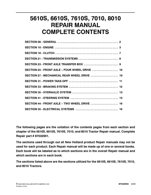 It is Complete Original Factory for New Holland 5610S, 6610S, 7610S, 7010, 8010 Tractor. Covers all the service and repair information about New Holland 5610S, 6610S, 7610S, 7010, 8010 Tractor. The information in this manual covers everything you need to know when you want to service and repair New Holland 5610S, 6610S, 7610S, 7010, 8010 Tractor.