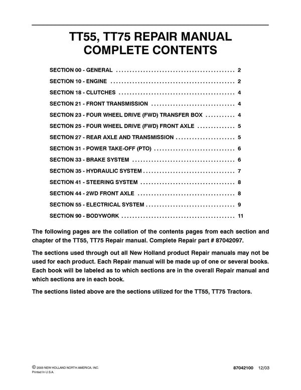 It is Complete Original Factory for New Holland TT55, TT75 Tractor. Covers all the service and repair information about New Holland TT55, TT75 Tractor. The information in this manual covers everything you need to know when you want to service and repair New Holland TT55, TT75 Tractor.