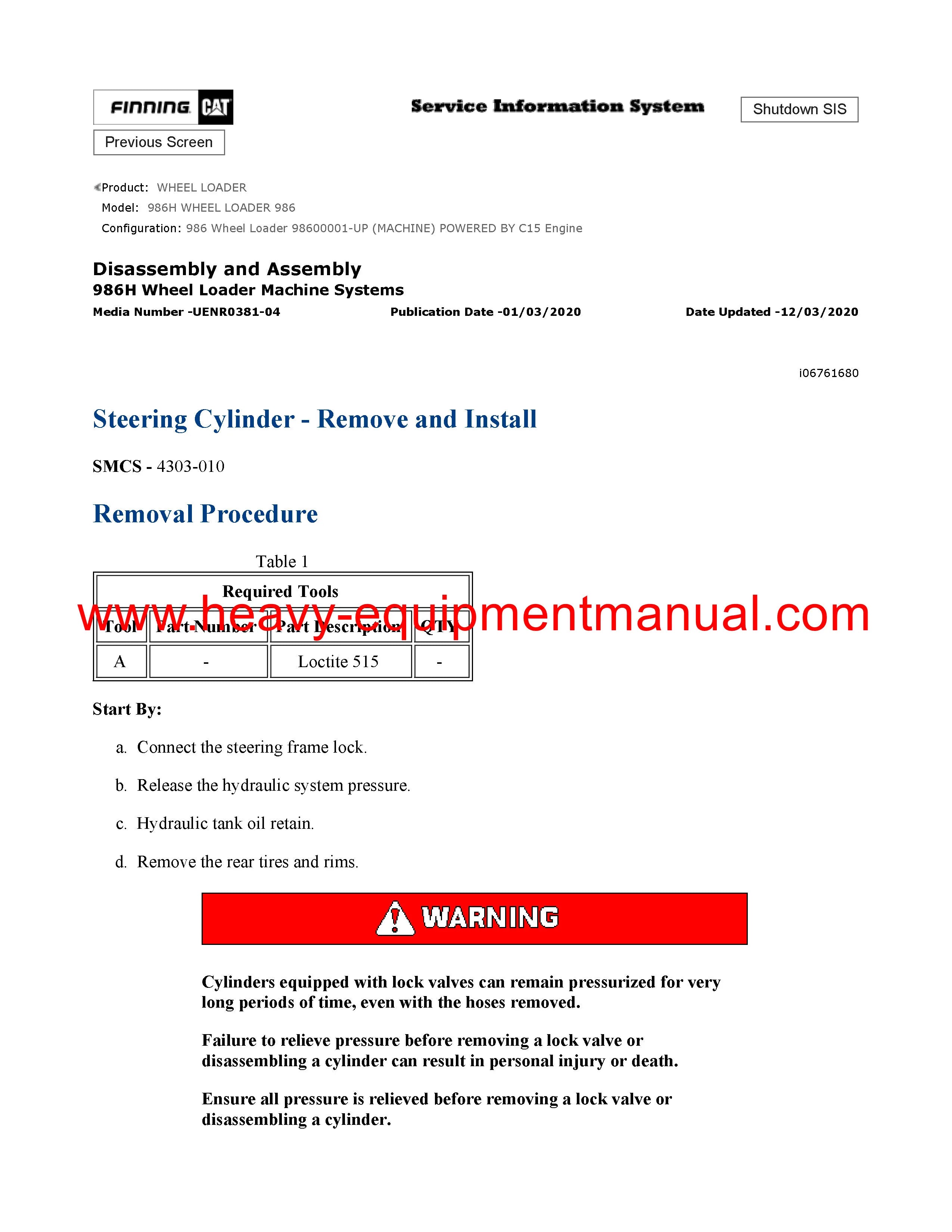 It is Complete Original Factory for Caterpillar 986H WHEEL LOADER. Covers all the service and repair information about Caterpillar 986H WHEEL LOADER. The information in this manual covers everything you need to know when you want to service and repair Caterpillar 986H WHEEL LOADER.