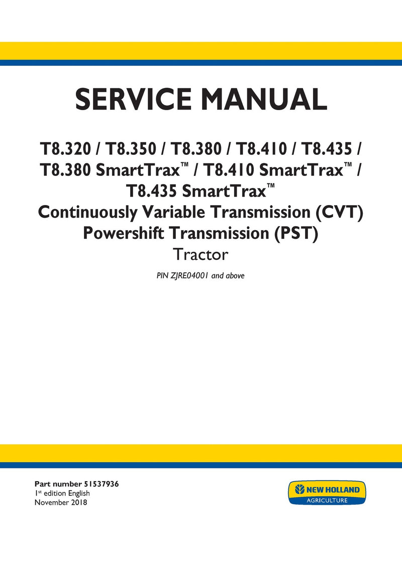 Download New Holland T8.320 T8.350 T8.380 T8.410 T8.435 T8.380 SmartTrax™ T8.410 SmartTrax™ T8.435 SmartTrax Tractor Service Repair Manual 51537936