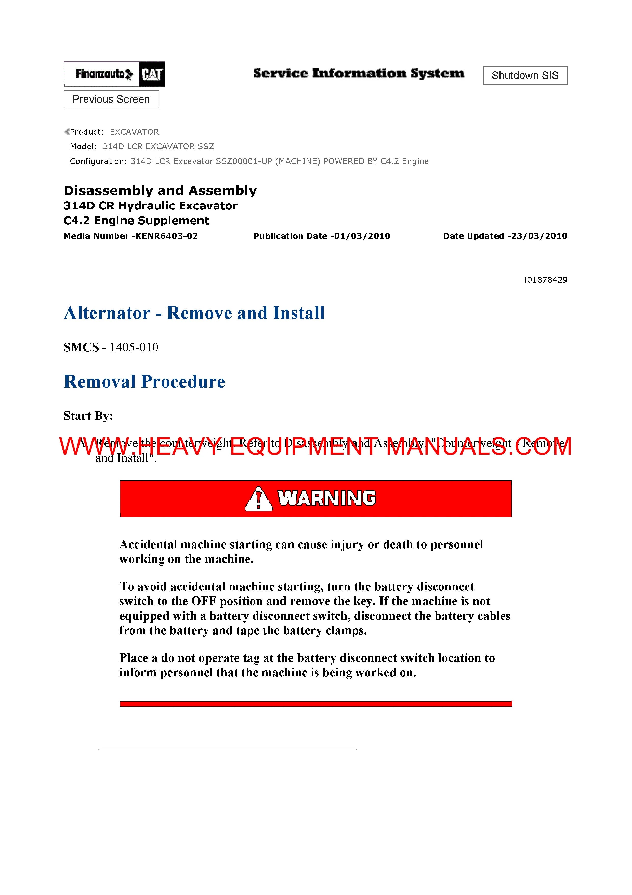 It is Complete Original Factory for Caterpillar 314D LCR EXCAVATOR. Covers all the service and repair information about Caterpillar 314D LCR EXCAVATOR. The information in this manual covers everything you need to know when you want to service and repair Caterpillar 314D LCR EXCAVATOR.