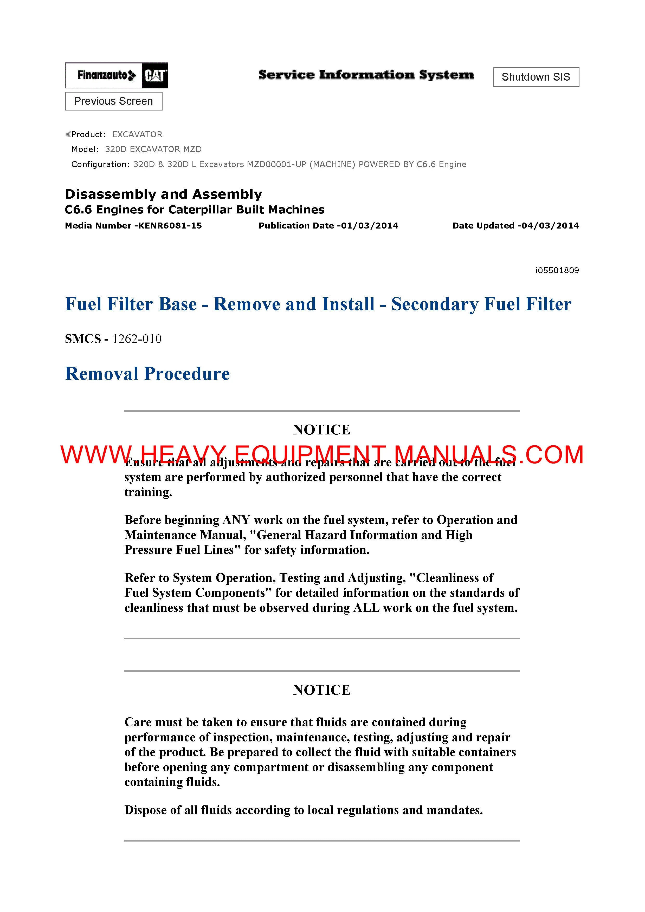 It is Complete Original Factory for Caterpillar 320D EXCAVATOR. Covers all the service and repair information about Caterpillar 320D EXCAVATOR. The information in this manual covers everything you need to know when you want to service and repair Caterpillar 320D EXCAVATOR.
