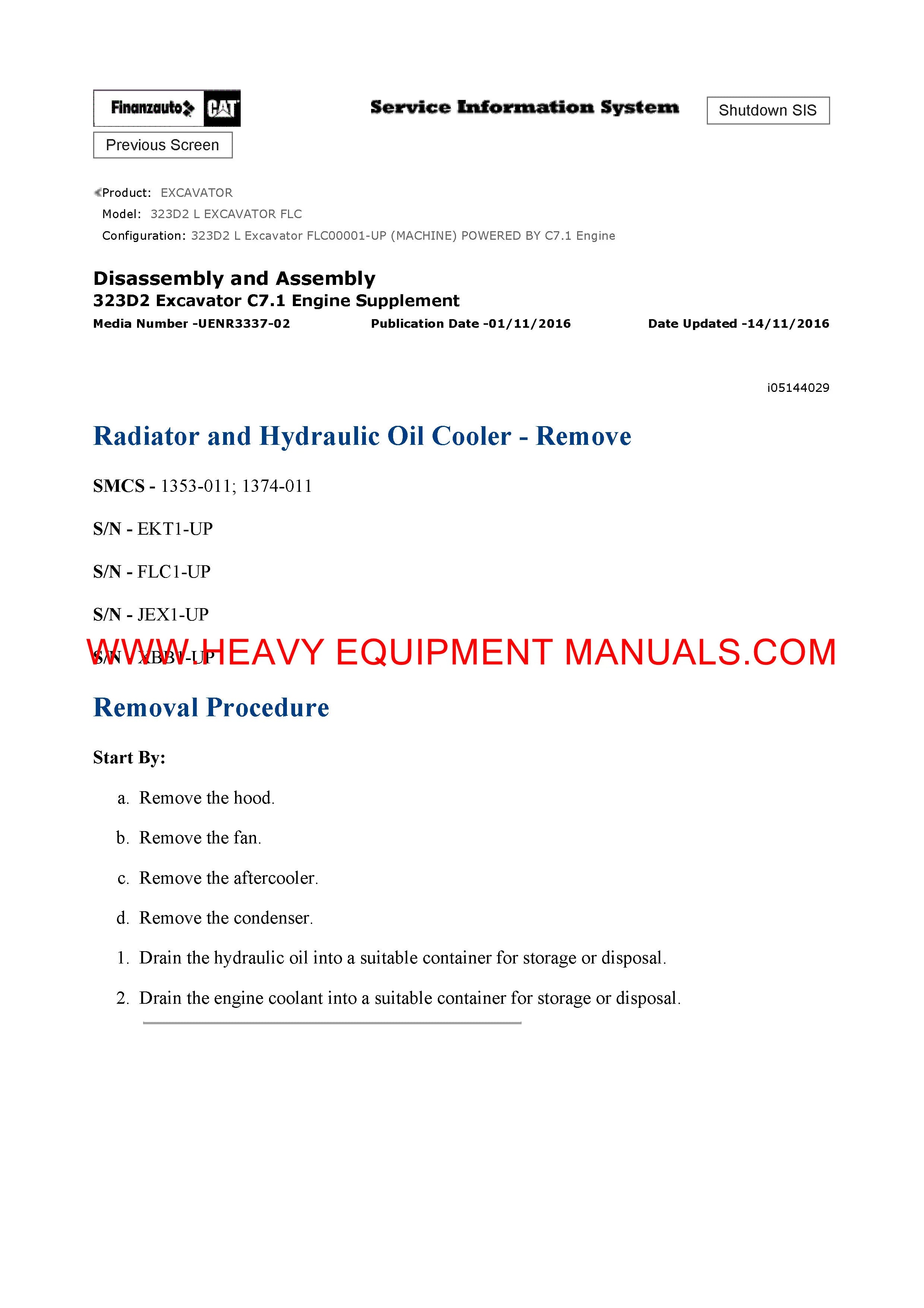 It is Complete Original Factory for Caterpillar 323D2 L EXCAVATOR. Covers all the service and repair information about Caterpillar 323D2 L EXCAVATOR. The information in this manual covers everything you need to know when you want to service and repair Caterpillar 323D2 L EXCAVATOR.