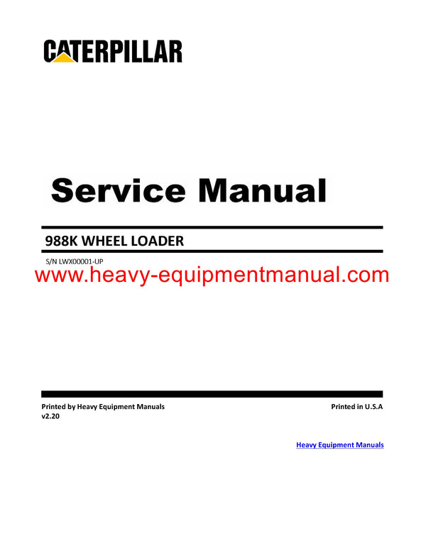 It is Complete Original Factory for Caterpillar 988K WHEEL LOADER. Covers all the service and repair information about Caterpillar 988K WHEEL LOADER. The information in this manual covers everything you need to know when you want to service and repair Caterpillar 988K WHEEL LOADER.