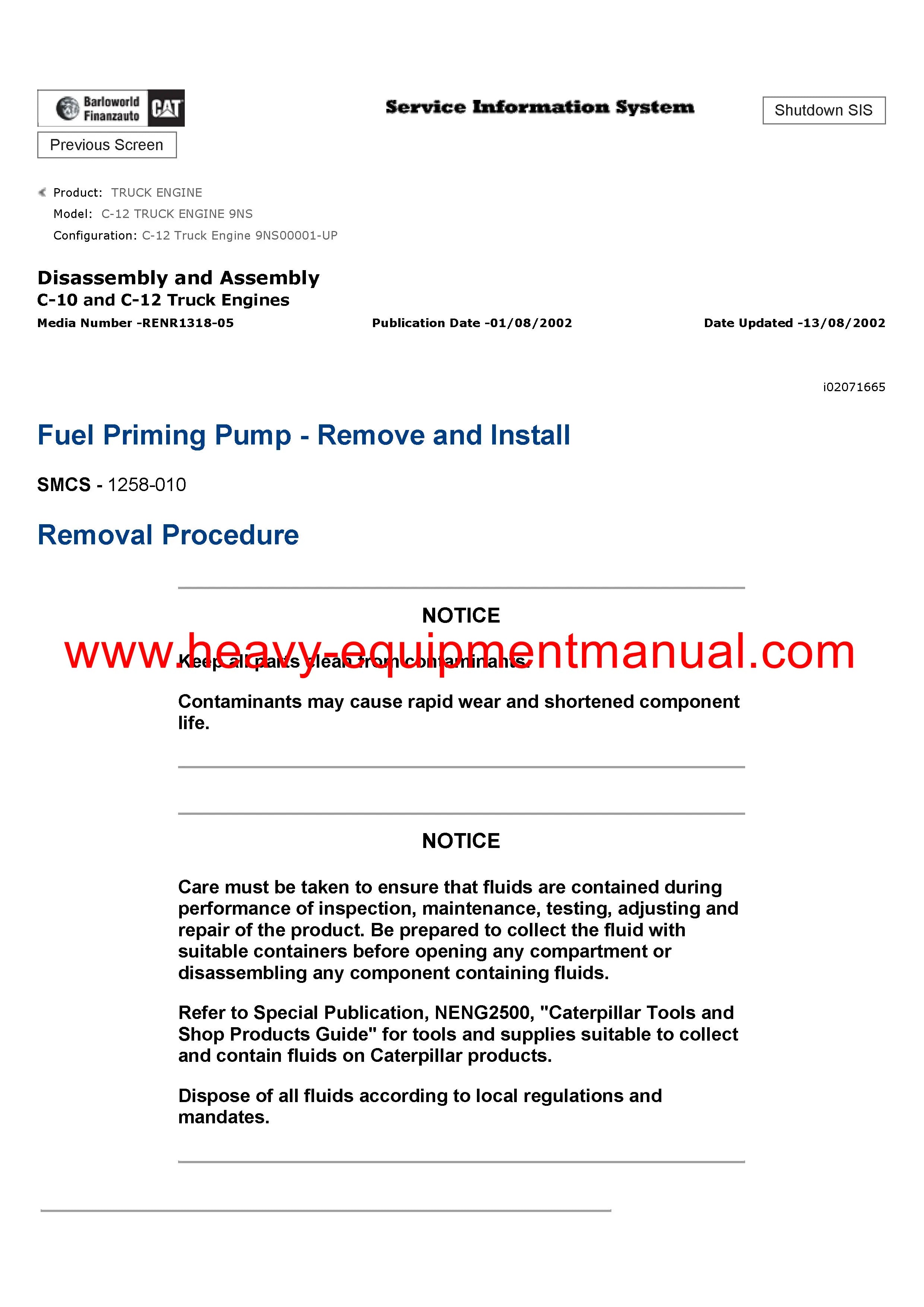 It is Complete Original Factory for Caterpillar C-12 TRUCK ENGINE. Covers all the service and repair information about Caterpillar C-12 TRUCK ENGINE. The information in this manual covers everything you need to know when you want to service and repair Caterpillar C-12 TRUCK ENGINE.