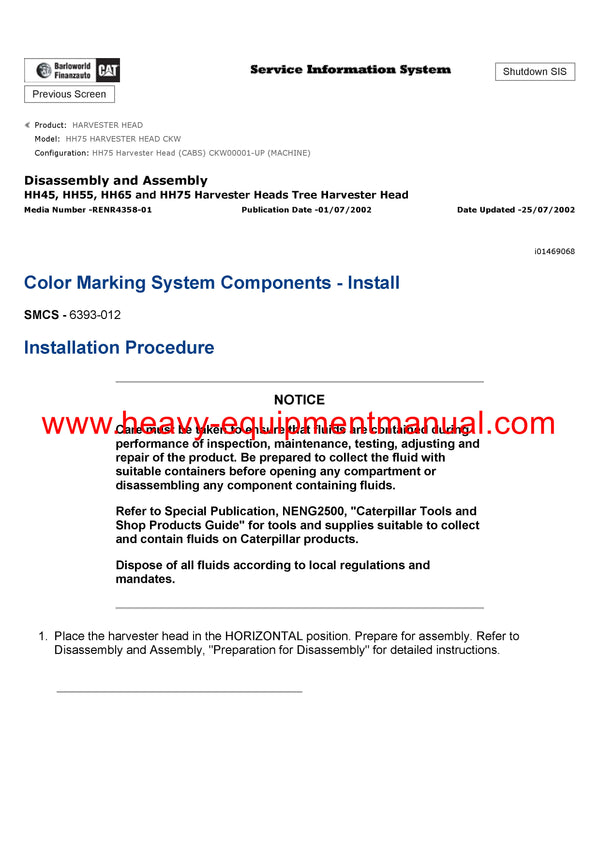 It is Complete Original Factory for Caterpillar HH75 HARVESTER HEAD. Covers all the service and repair information about Caterpillar HH75 HARVESTER HEAD. The information in this manual covers everything you need to know when you want to service and repair Caterpillar HH75 HARVESTER HEAD.