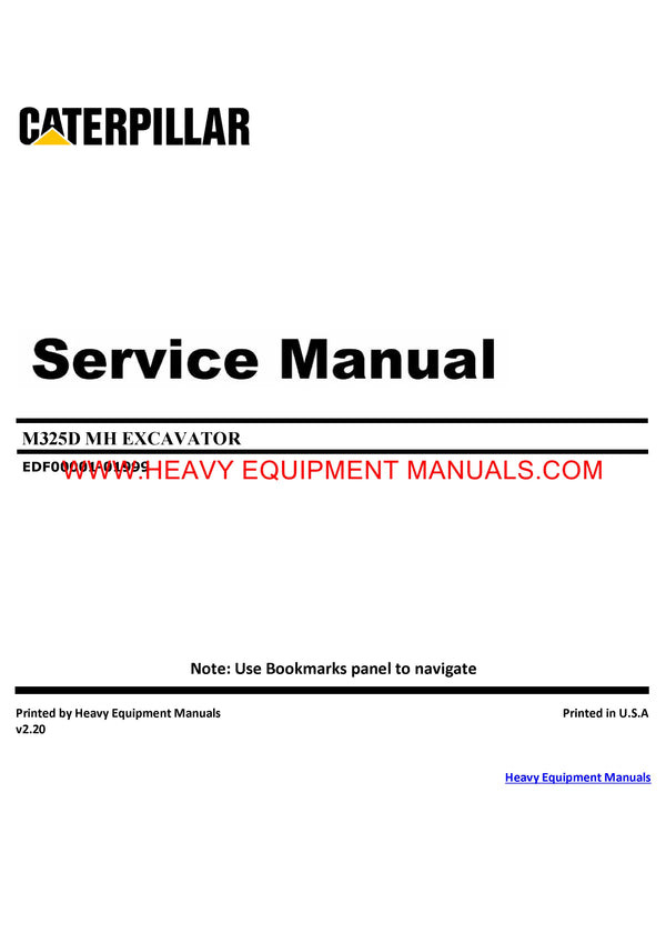 It is Complete Original Factory for Caterpillar M325D MH EXCAVATOR. Covers all the service and repair information about Caterpillar M325D MH EXCAVATOR. The information in this manual covers everything you need to know when you want to service and repair Caterpillar M325D MH EXCAVATOR.