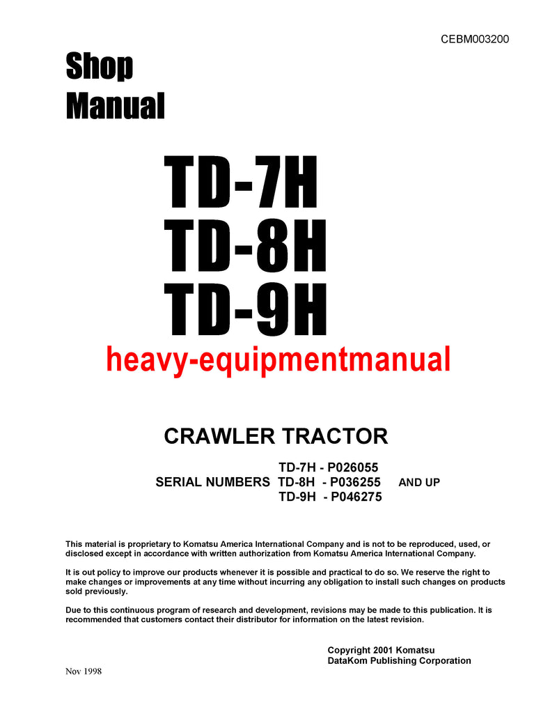 Unlock the full potential of your Komatsu Td-9h Bulldozer with our comprehensive service manual! Get instant access to expert guidance and step-by-step instructions for maintaining and repairing your machine. Increase productivity and efficiency on the job with this invaluable resource. Download now and take your performance to the next level!