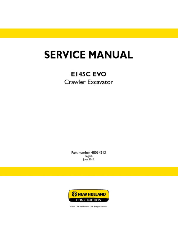 It is Complete Original Factory for New Holland E145C EVO Crawler Excavator. Covers all the service and repair information about New Holland E145C EVO Crawler Excavator. The information in this manual covers everything you need to know when you want to service and repair New Holland E145C EVO Crawler Excavator.