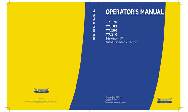 Download New Holland T7.170 T7.185 T7.200 T7.210 Sidewinder II Auto Command Tractor Operator's Manual