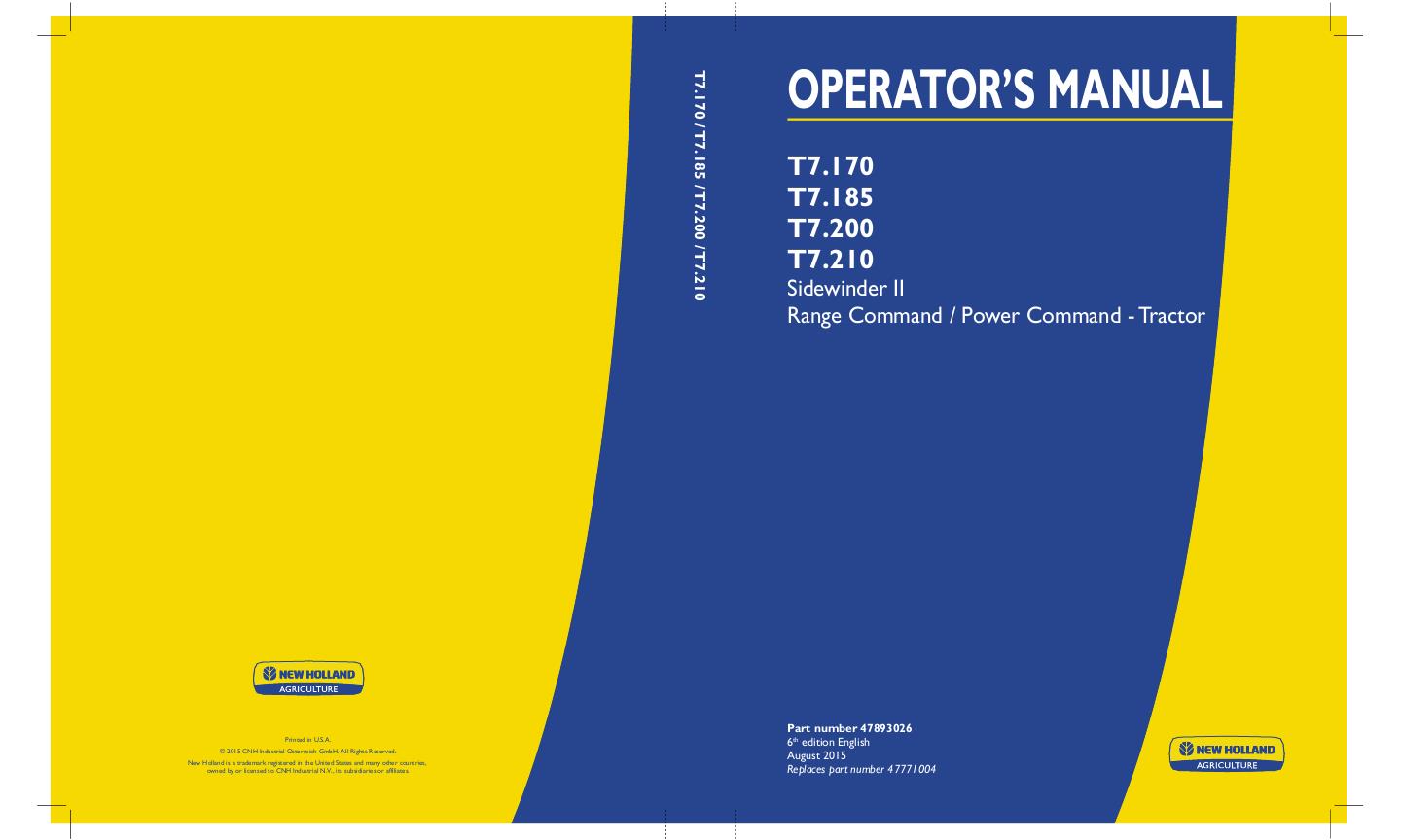 Download New Holland T7.170 T7.185 T7.200 T7.210 Sidewinder II Range Command Power Command Tractor Operator's Manual