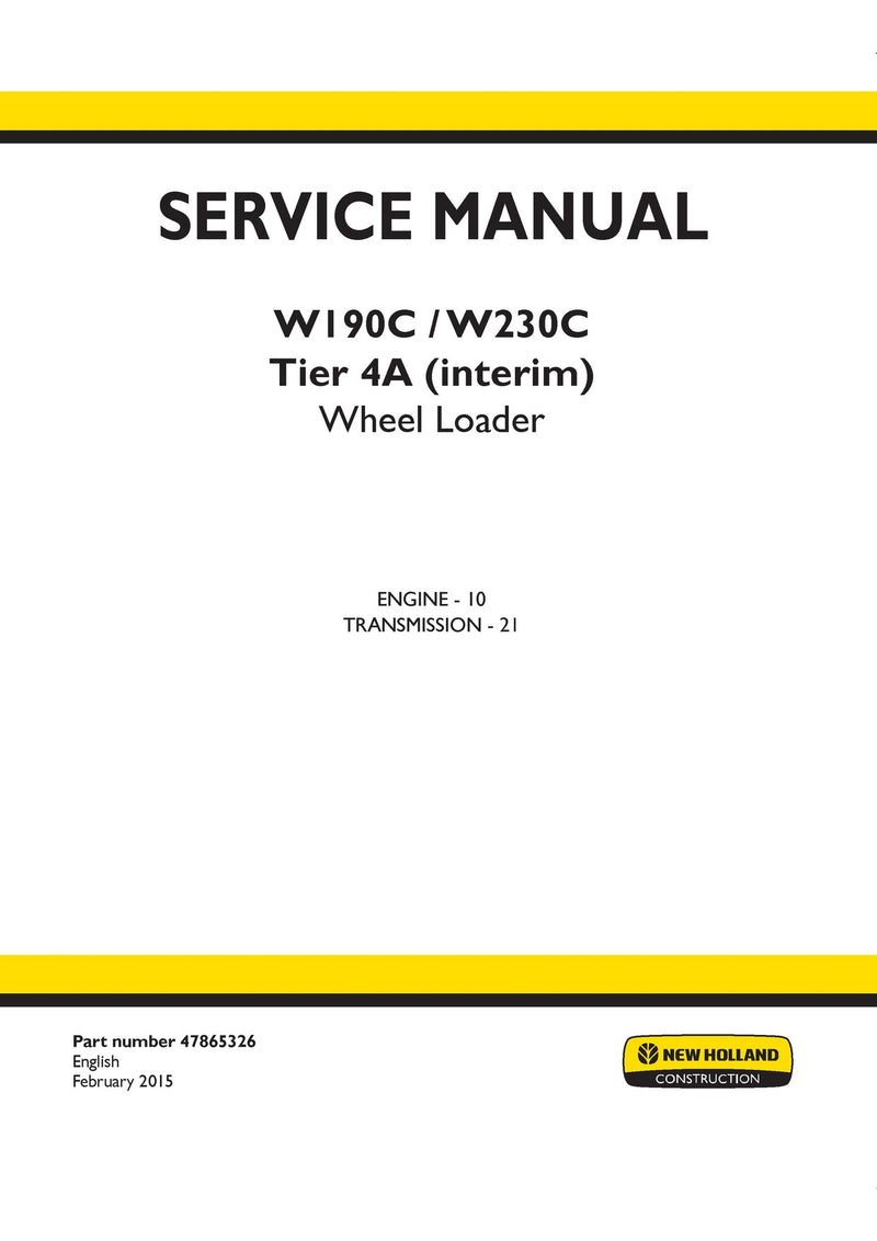 It is Complete Original Factory for New Holland W190C, W230C Tier 4A (interim) Wheel Loader. Covers all the service and repair information about New Holland W190C, W230C Tier 4A (interim) Wheel Loader. The information in this manual covers everything you need to know when you want to service and repair New Holland W190C, W230C Tier 4A (interim) Wheel Loader.