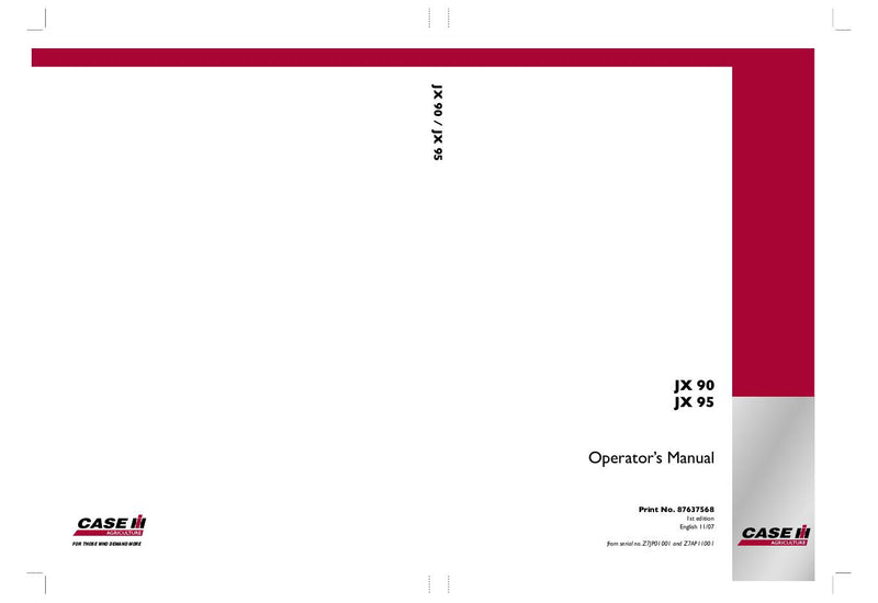 It is an Complete Factory original factory Operator's Manual For Case IH Tractor JX90 JX95 Operator’s. We Offers Manual HIGH quality images, diagrams, instructions to help you to operate. This document is printable, without restrictions, contains searchable text, bookmarks, crosslinks for easy navigation.
