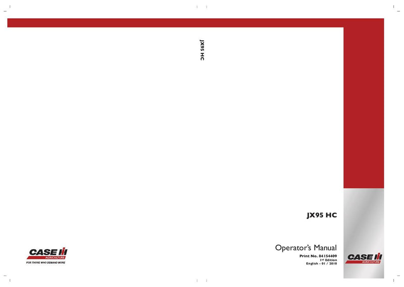 It is an Complete Factory original factory Operator's Manual For Case IH Tractor JX95 HC Operator’s. We Offers Manual HIGH quality images, diagrams, instructions to help you to operate. This document is printable, without restrictions, contains searchable text, bookmarks, crosslinks for easy navigation.