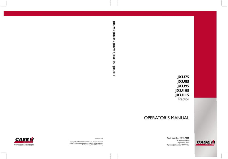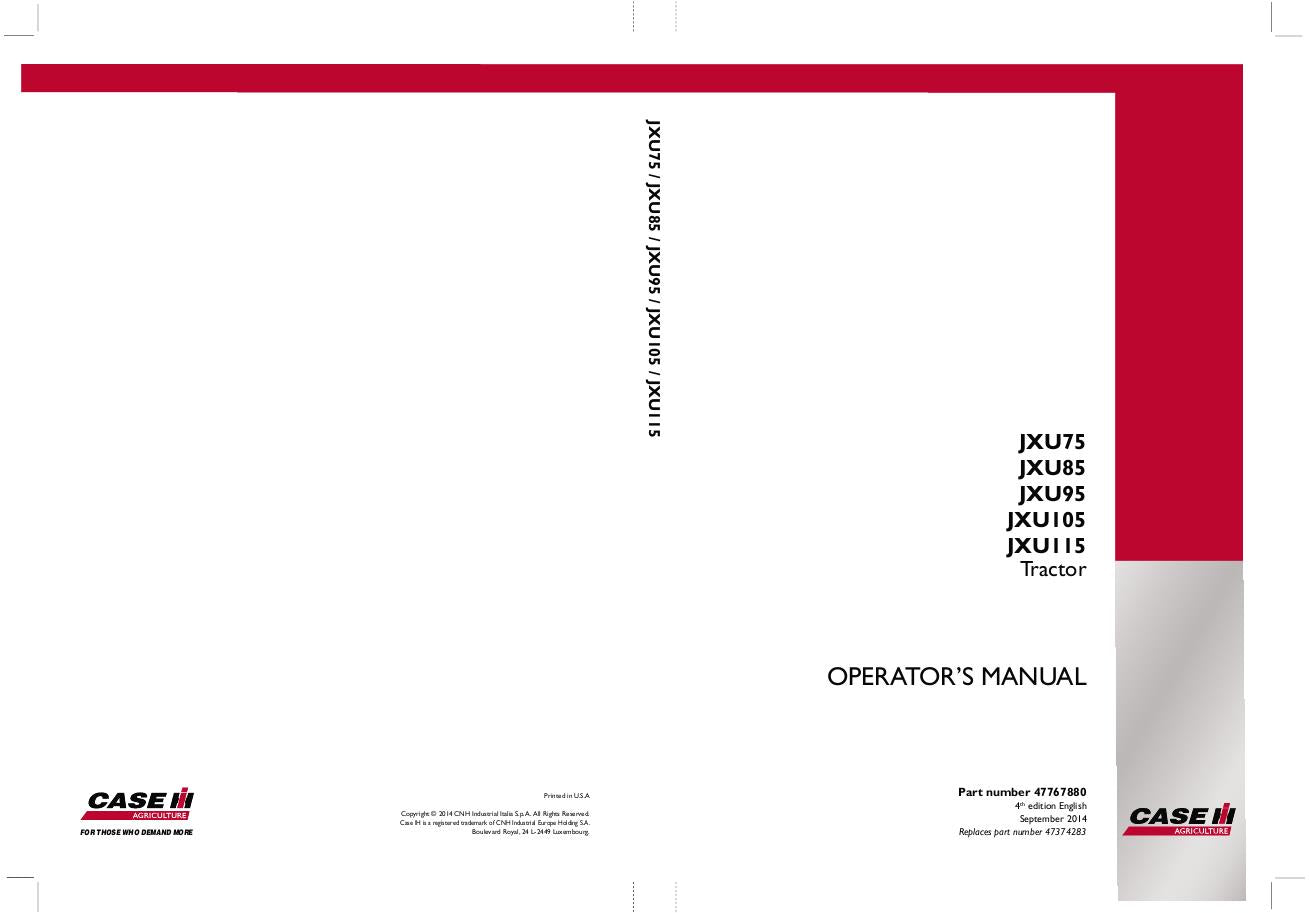 It is an Complete Factory original factory Operator's Manual For Case IH Tractor JXU75 JXU85 JXU95 JXU105 JXU115 Operator’s. We Offers Manual HIGH quality images, diagrams, instructions to help you to operate. This document is printable, without restrictions, contains searchable text, bookmarks, crosslinks for easy navigation.