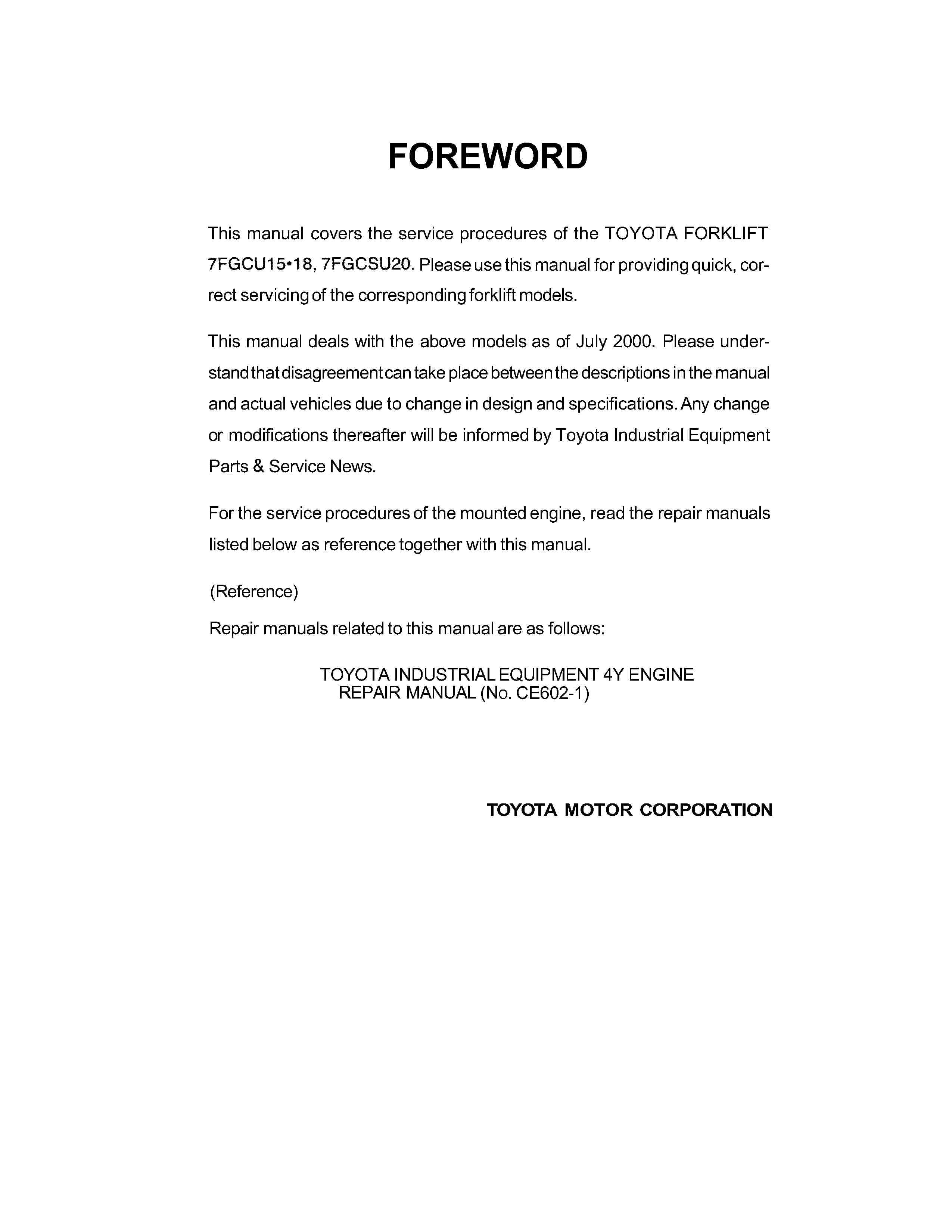 Original factory manuals for Toyota Forklift Trucks, contains high quality images, circuit diagrams and instructions to help you to operate, maintenance and repair your truck. All Manuals Printable, contains Searchable Text and Navigation Bookmarks