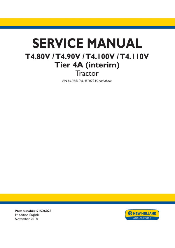 It is Complete Original Factory for New Holland T4.80V, T4.90V, T4.100V, T4.110V Tier 4A (interim) Tractor. Covers all the service and repair information about New Holland T4.80V, T4.90V, T4.100V, T4.110V Tier 4A (interim) Tractor. The information in this manual covers everything you need to know when you want to service and repair New Holland T4.80V, T4.90V, T4.100V, T4.110V Tier 4A (interim) Tractor.
