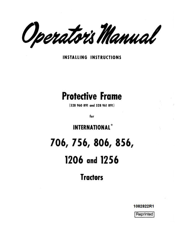 It is an Complete Factory original factory Operator's Manual For Case IH Tractor Protective Frame for Intl 706 756 806 856 1206 and 1256. We Offers Manual HIGH quality images, diagrams, instructions to help you to operate. This document is printable, without restrictions, contains searchable text, bookmarks, crosslinks for easy navigation.