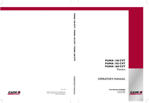 It is an Complete Factory original factory Operator's Manual For Case IH Tractor PUMA 130 145 160 CVT. We Offers Manual HIGH quality images, diagrams, instructions to help you to operate. This document is printable, without restrictions, contains searchable text, bookmarks, crosslinks for easy navigation.