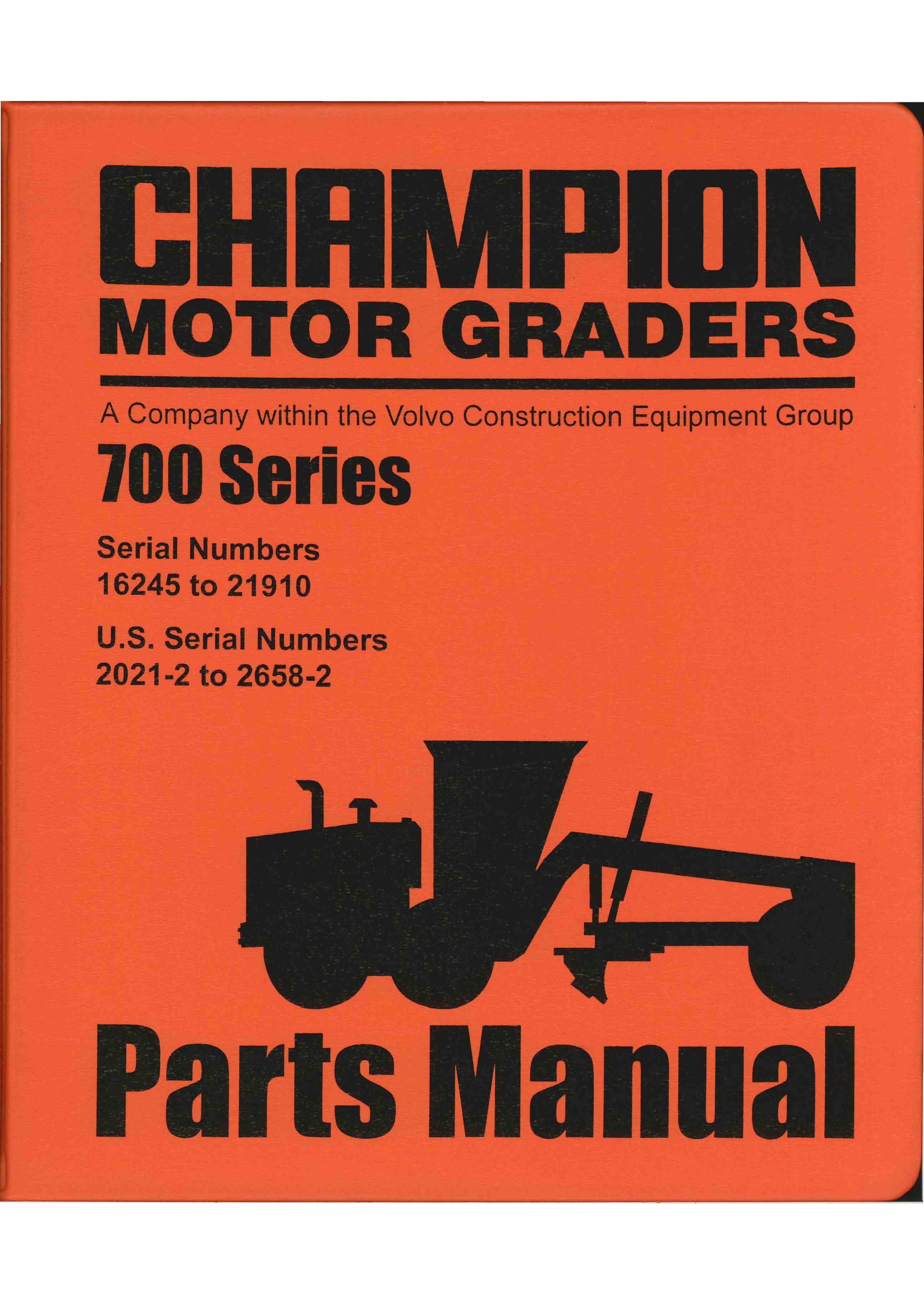 This Champion 700 Series Grader Parts Manual contains exploded views of your entire equipment with parts listings and part numbers. This manual will never let you order incorrect parts again!