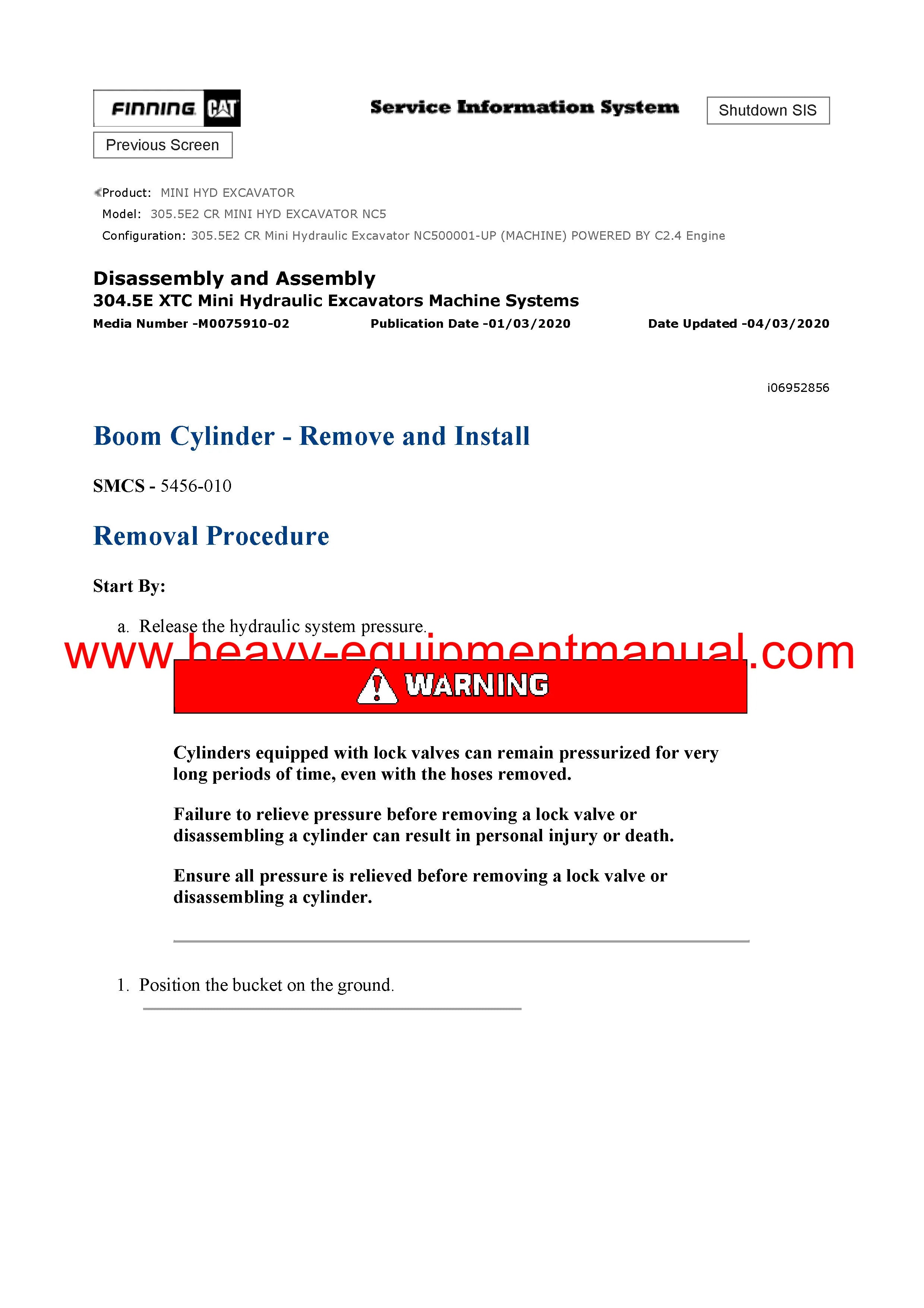 It is Complete Original Factory for Caterpillar 305.5E2 CR MINI HYD EXCAVATOR. Covers all the service and repair information about Caterpillar 305.5E2 CR MINI HYD EXCAVATOR. The information in this manual covers everything you need to know when you want to service and repair Caterpillar 305.5E2 CR MINI HYD EXCAVATOR.