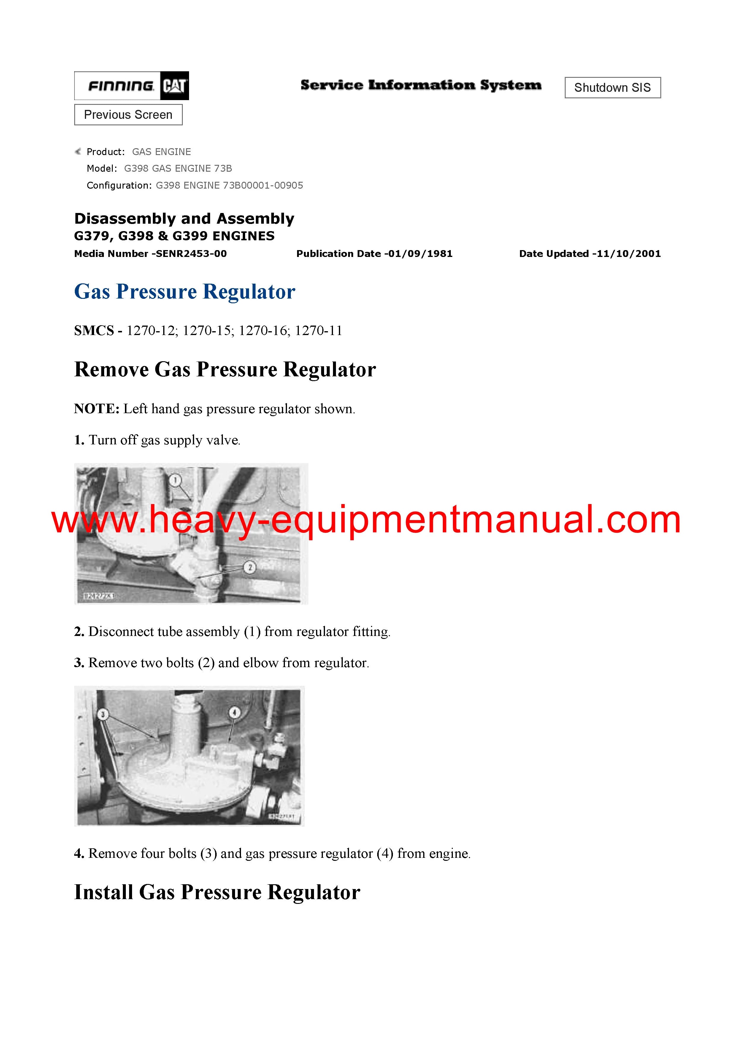 It is Complete Original Factory for Caterpillar G398 GAS ENGINE. Covers all the service and repair information about Caterpillar G398 GAS ENGINE. The information in this manual covers everything you need to know when you want to service and repair Caterpillar G398 GAS ENGINE.