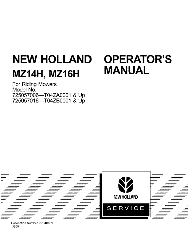 New Holland MZ14H, MZ16H Riding Mower Operator's Manual 87040099