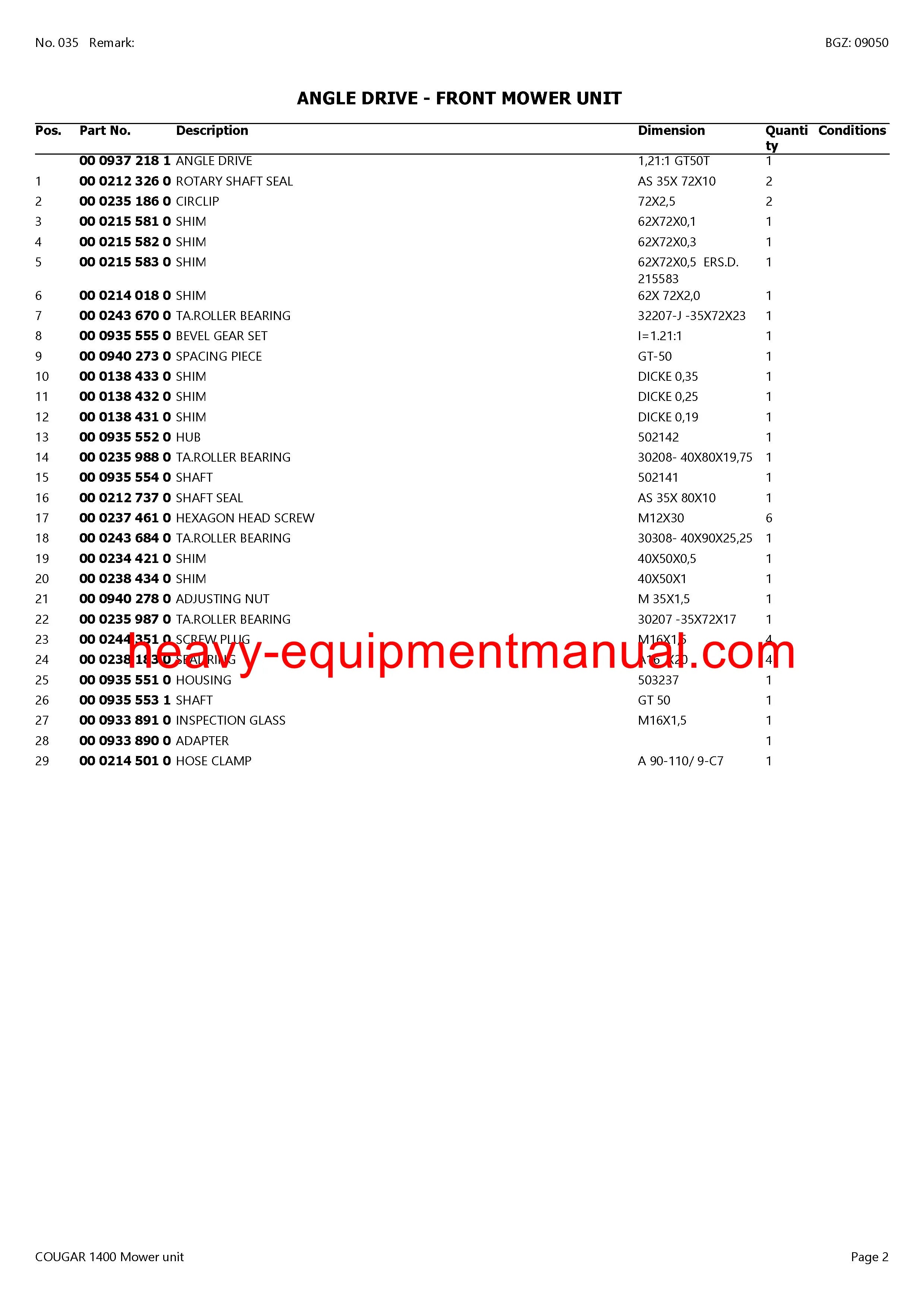 Download Claas Cougar 1400 Mower Base Machine Parts Manual PDF 78900011-78999999