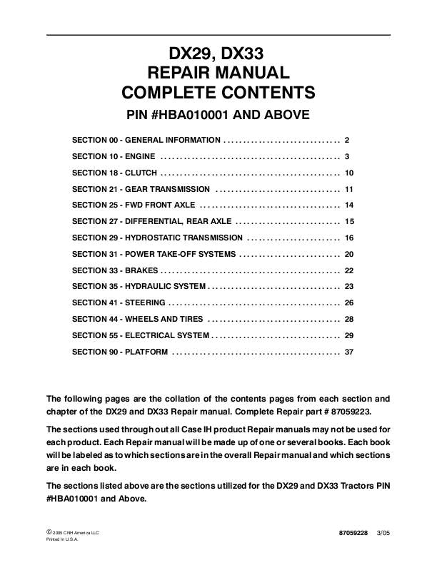 Case IH DX29, DX33 Tractors PIN #HBA010001 AND ABOVE