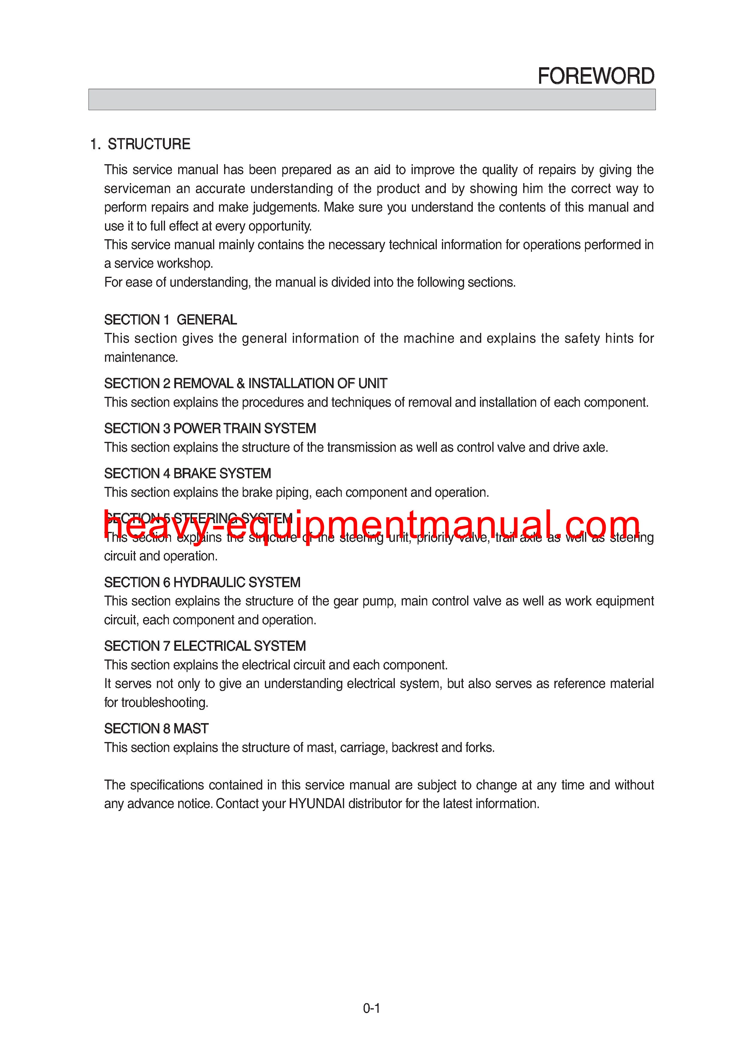It is Complete Original Factory for Hyundai 22/25/30/33D-9S Forklift Truck Service Manual covers all the service and repair information about Hyundai 22/25/30/33D-9S Forklift Truck. The information in this manual covers everything you need to know when you want to repair Hyundai 22/25/30/33D-9S Forklift Truck.