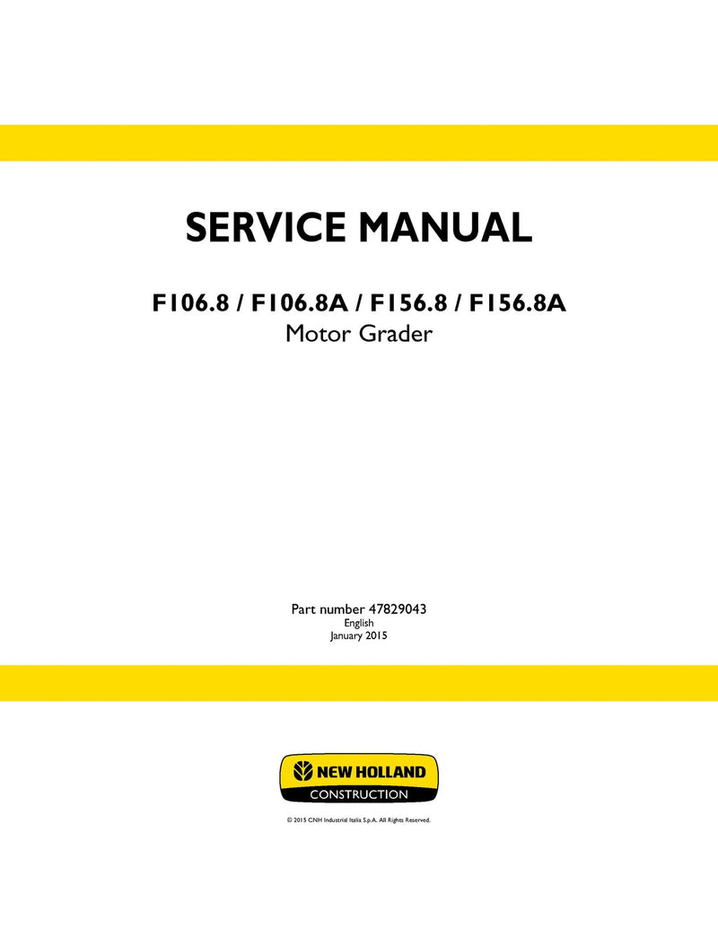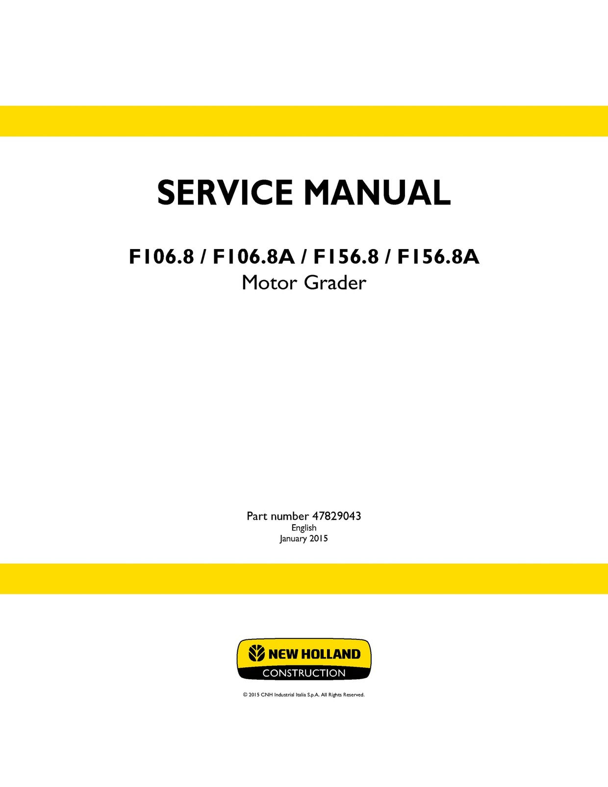 It is Complete Original Factory for New Holland F106.8, F106.8A, F156.8, F156.8A Motor Grader. Covers all the service and repair information about New Holland F106.8, F106.8A, F156.8, F156.8A Motor Grader. The information in this manual covers everything you need to know when you want to service and repair New Holland F106.8, F106.8A, F156.8, F156.8A Motor Grader.
