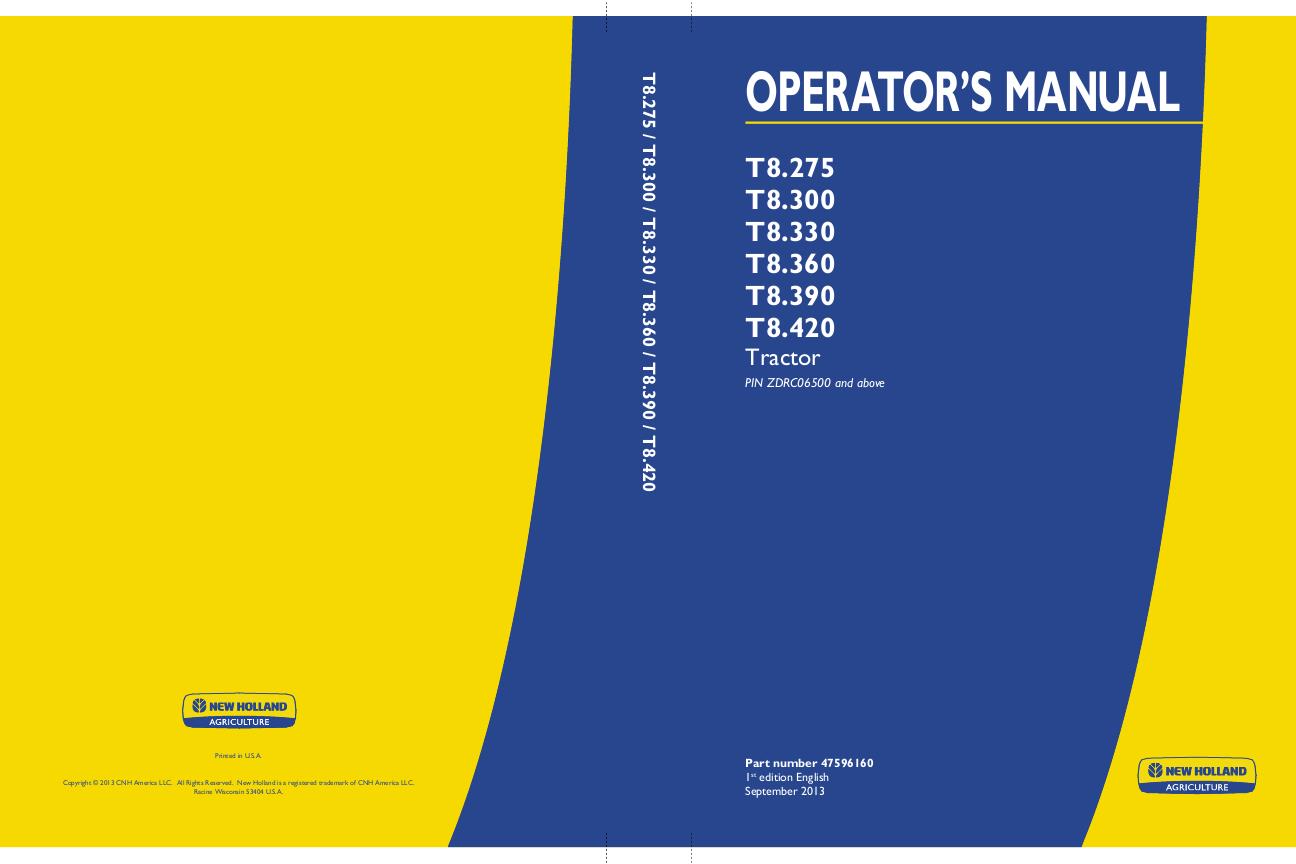 New Holland T8.275 T8.300 T8.330 T8.360 T8.390 T8.420 Tractor Operator's Manual 47596160